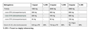 Ingredienser: Omega-3 fiskolja (från ansjovis), kapselhölje (bovintgelatin), stabiliseringsmedel (glycerol), DL-alfatokoferylacetat.